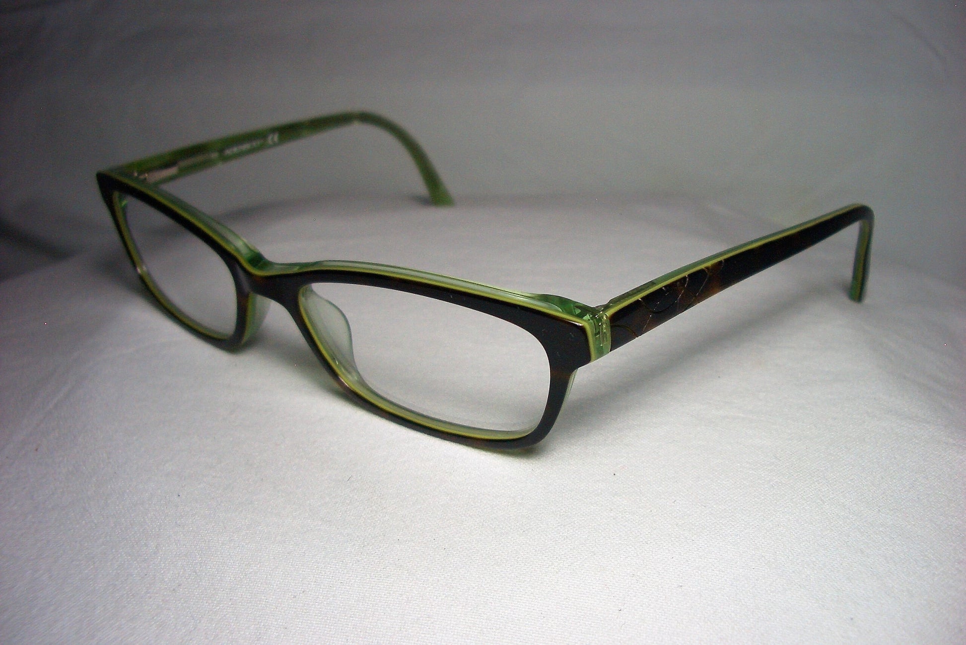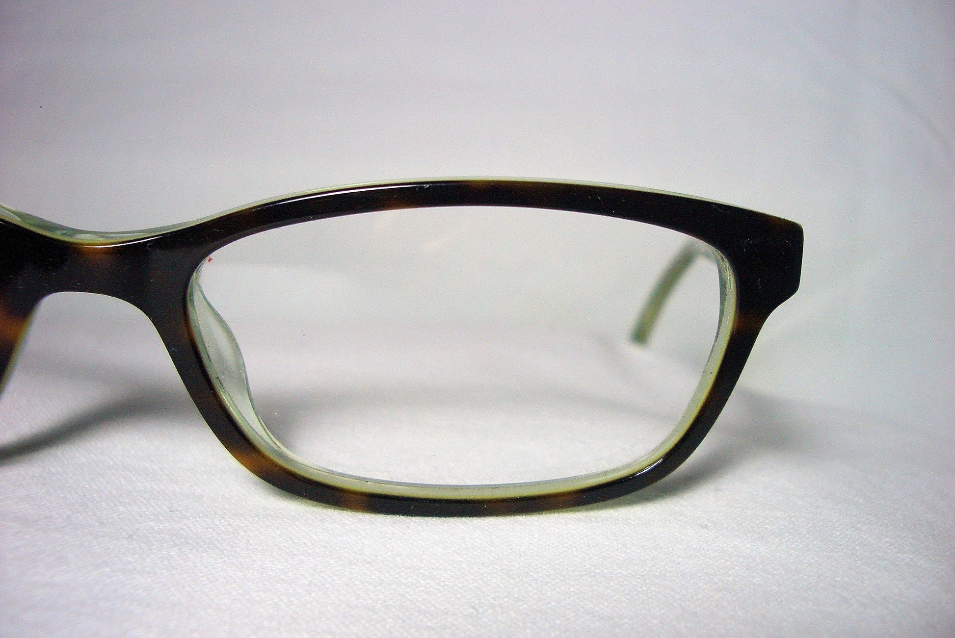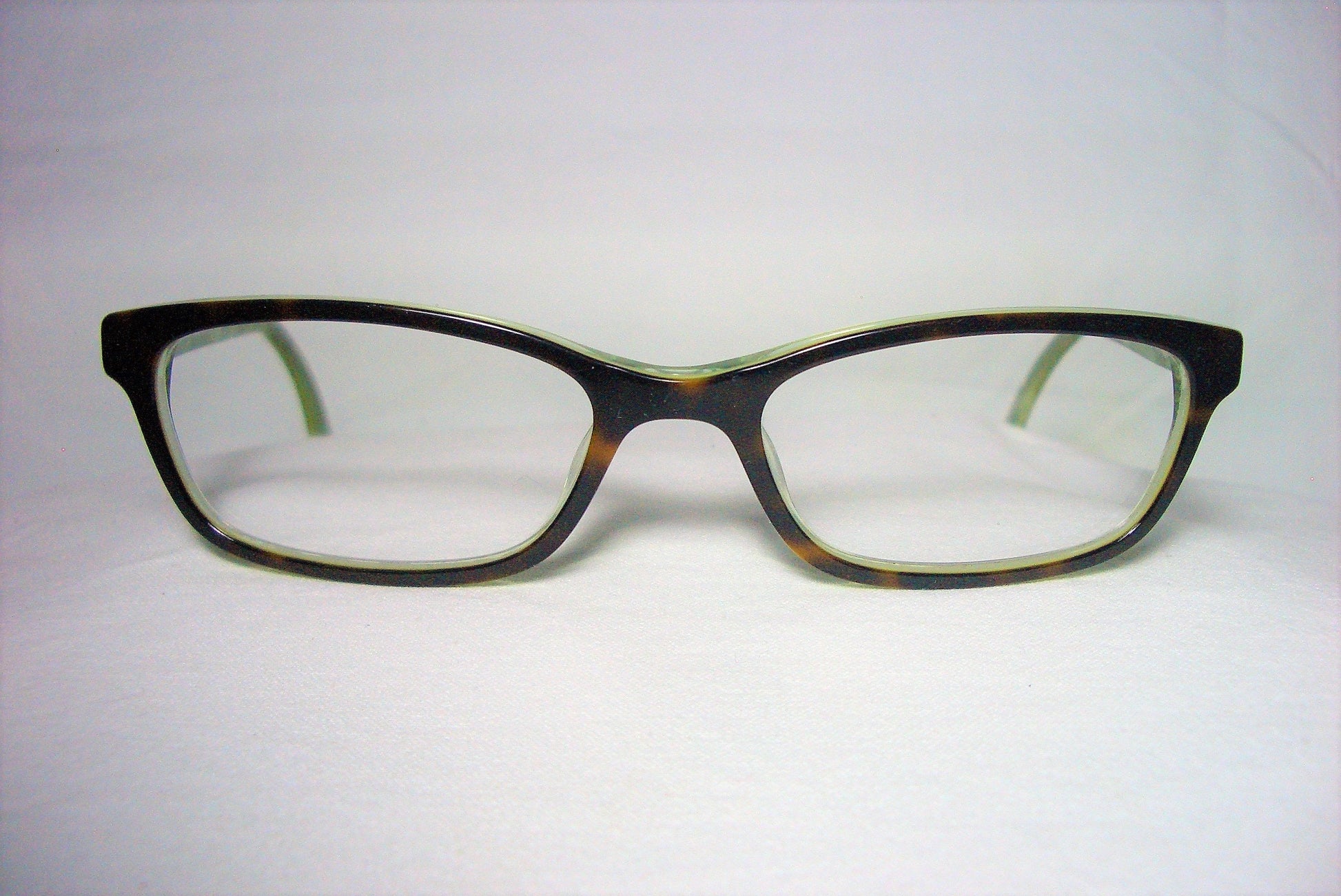 Medium Havana/sea green acetate frame, with RX lenses that can be replaced with either prescription or sun lenses.