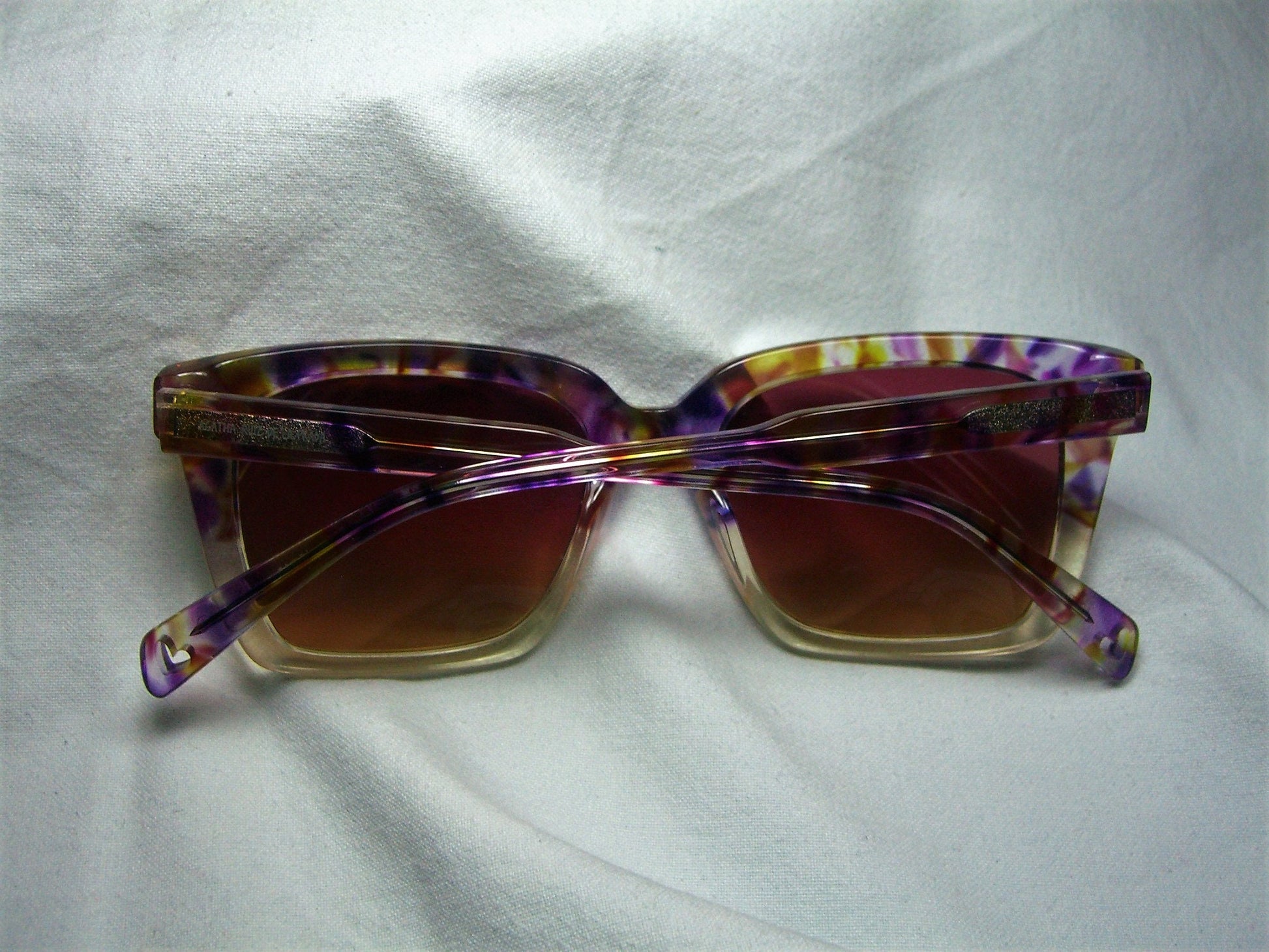 Hand made multi-color/clear acetate frame, elegantly embellished with cut out hearts and silver logo on temple stems, fitted with high impact, polarized gradient brown poly-carbonate lenses.