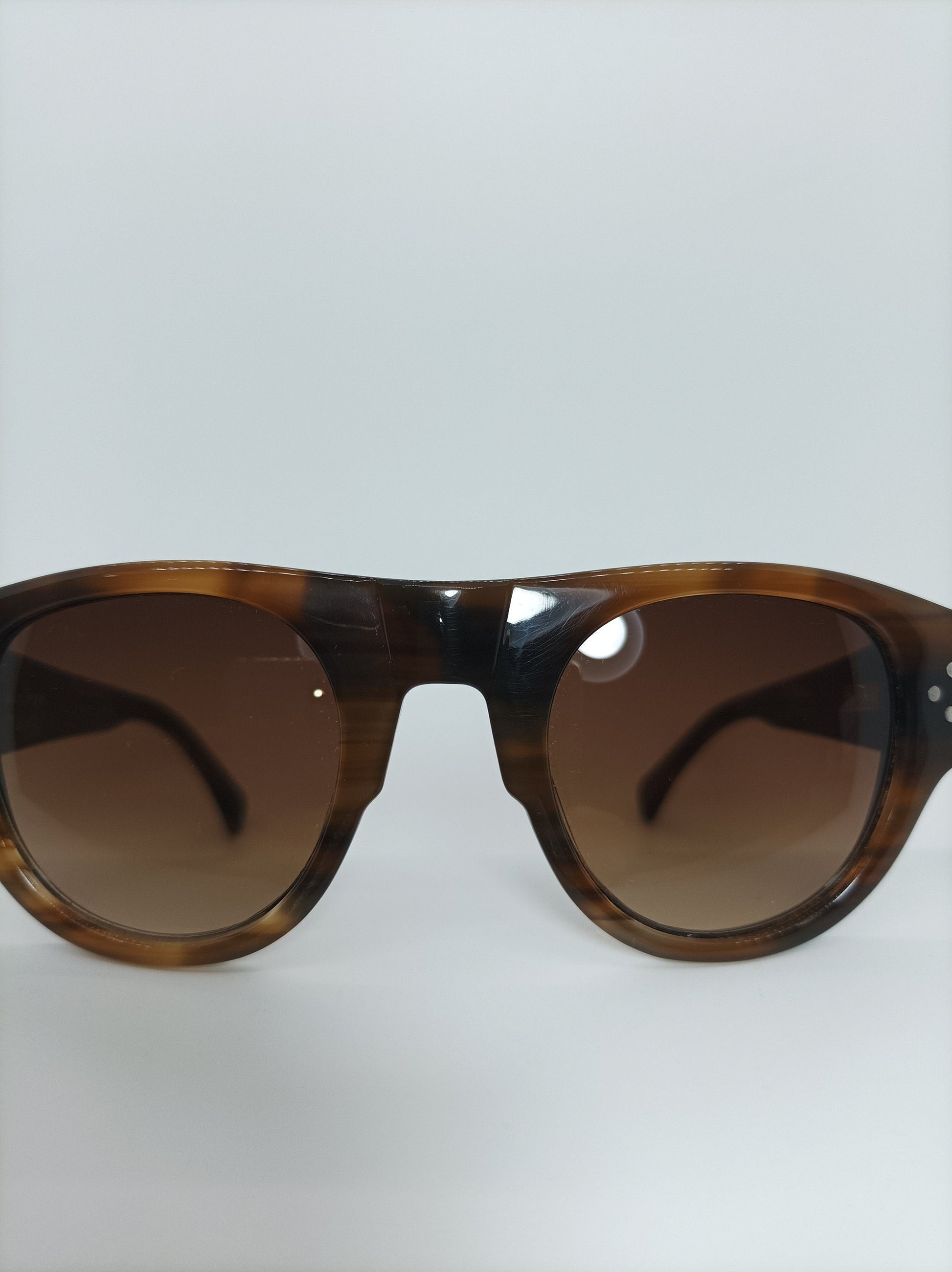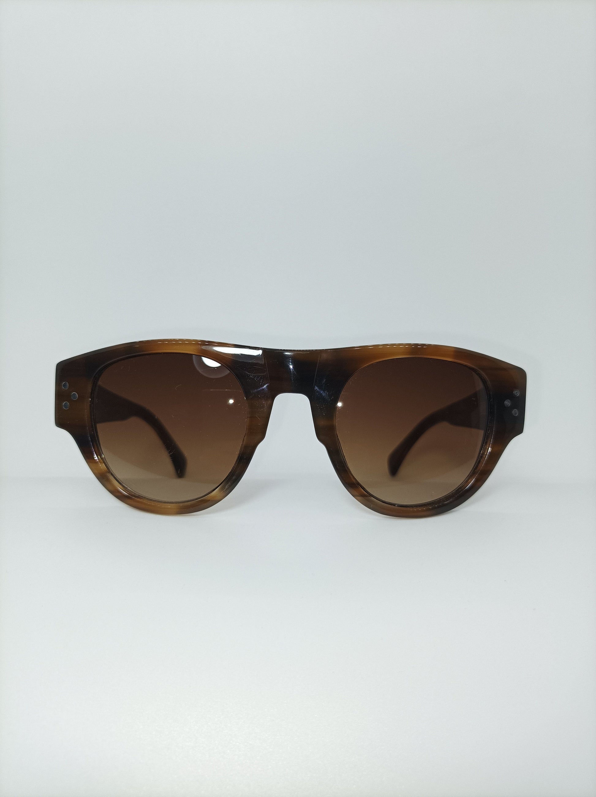 Entirely hand made medium Havana tortoise Italian acetate frame, fitted with high impact, polarized, gradient smokey brown Nylon lenses, elegantly ornamented with gold signature logo on temple stems, equipped with high performance hinge systems, all in a most delightful modernist frame architecture.