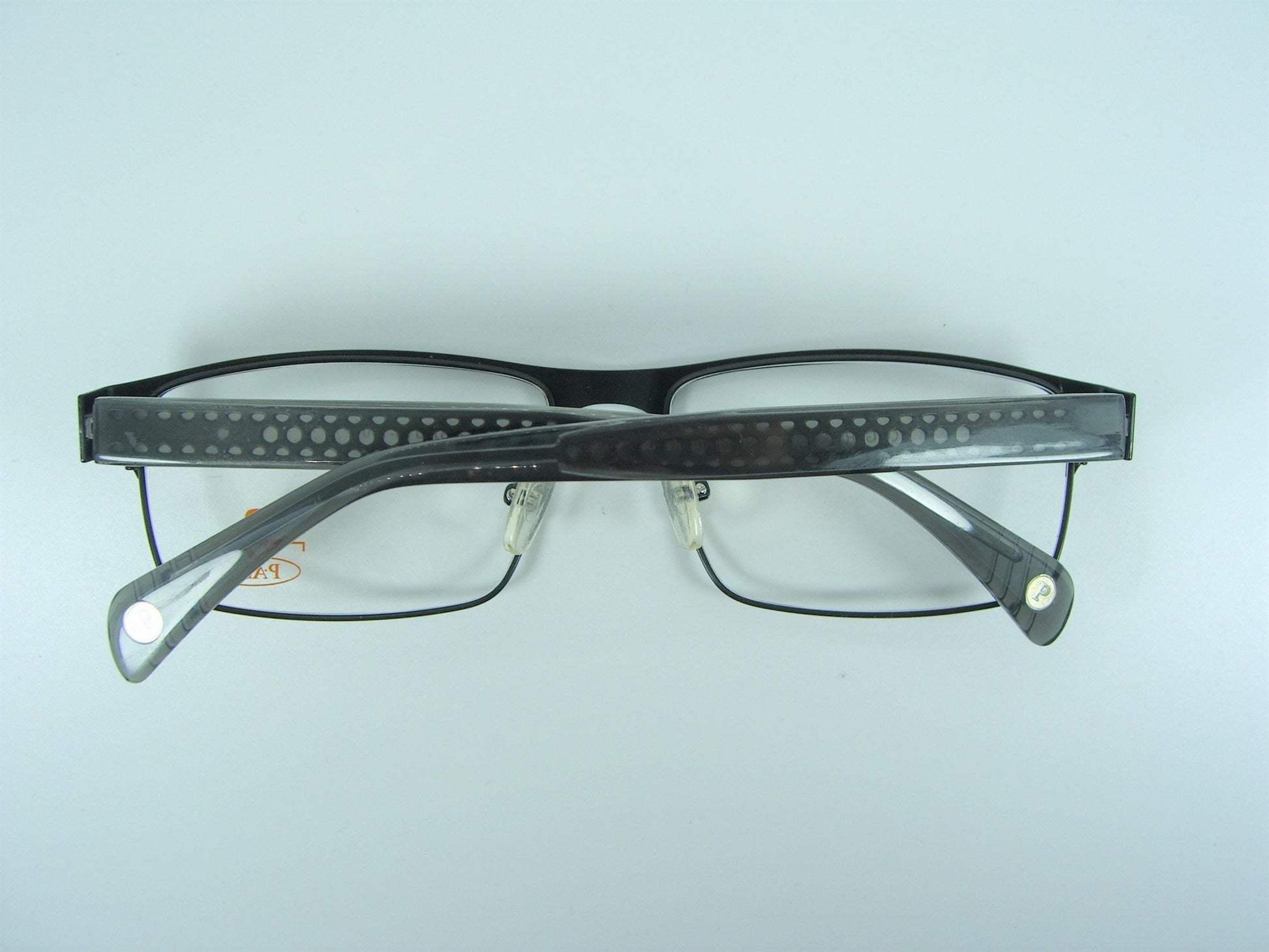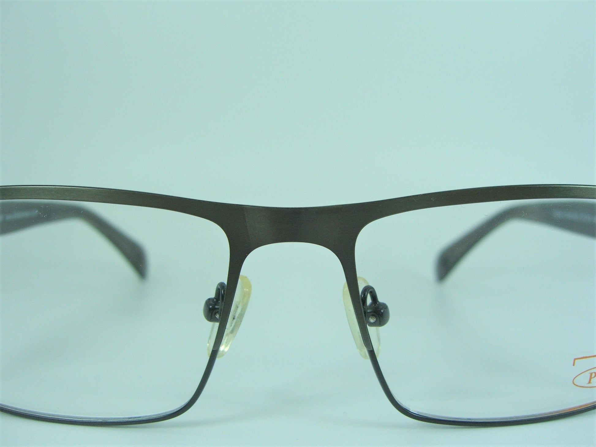 Hand made anodized graphite gray Titanium alloy super-thin frame, elegantly complemented with smokey gray German acetate jacketed temple stem, tastefully ornate with round "P" disks on stem ends, equipped with high performance spring systems, all in a most modernist frame architecture.