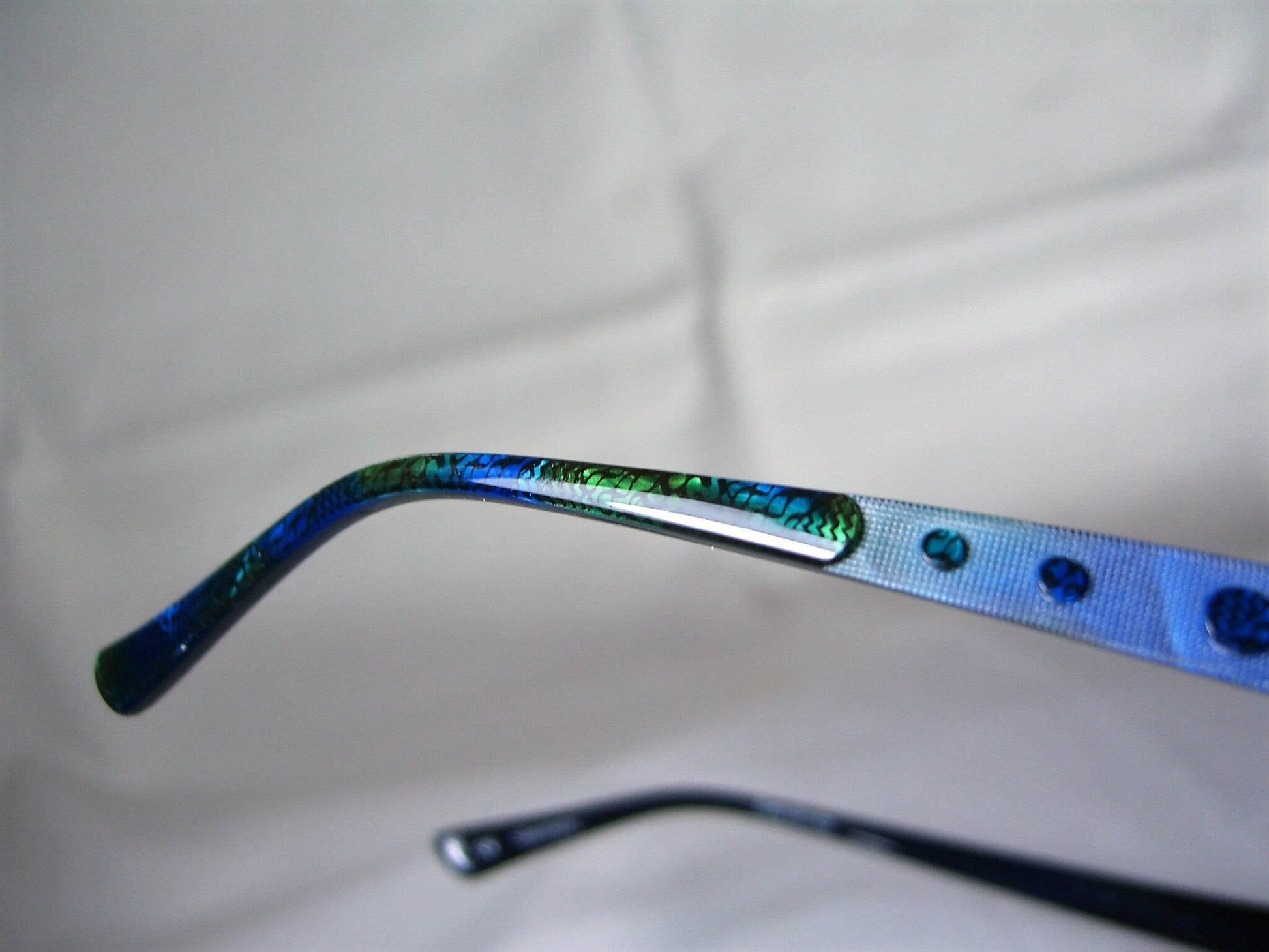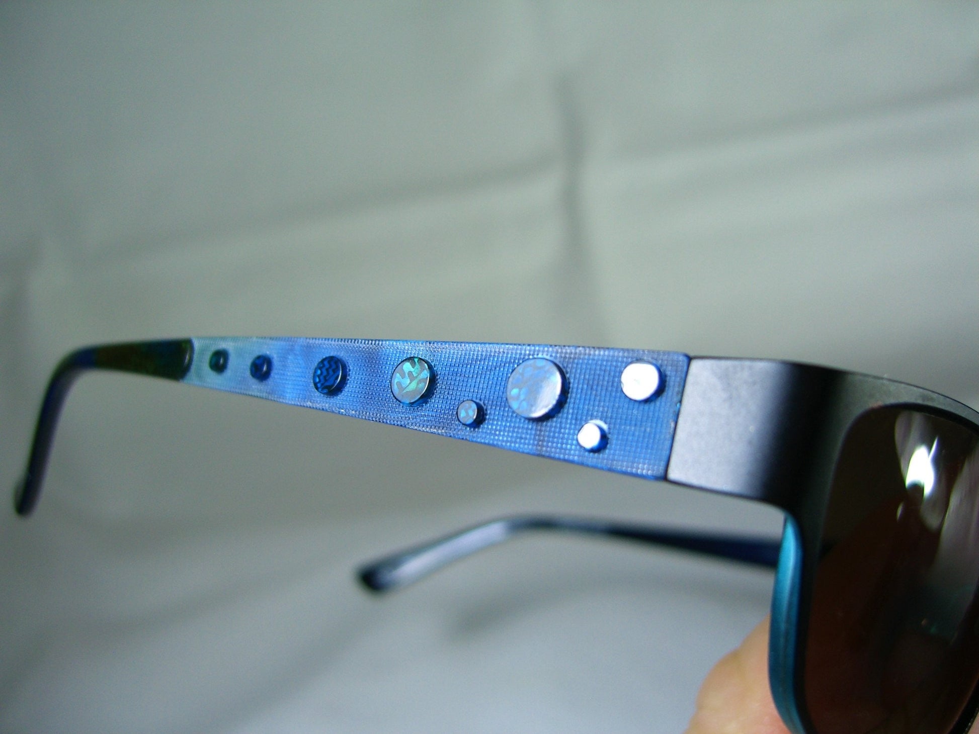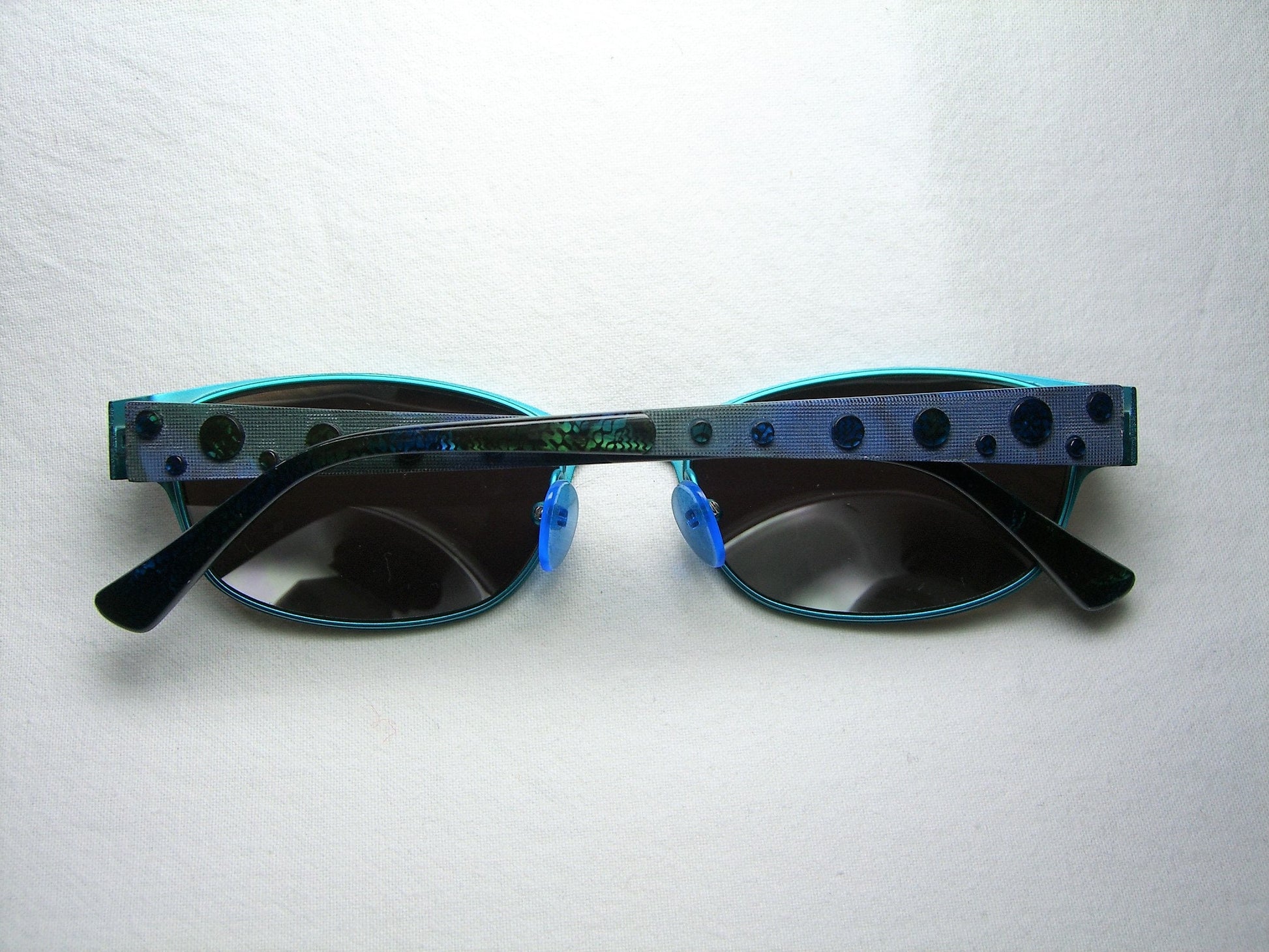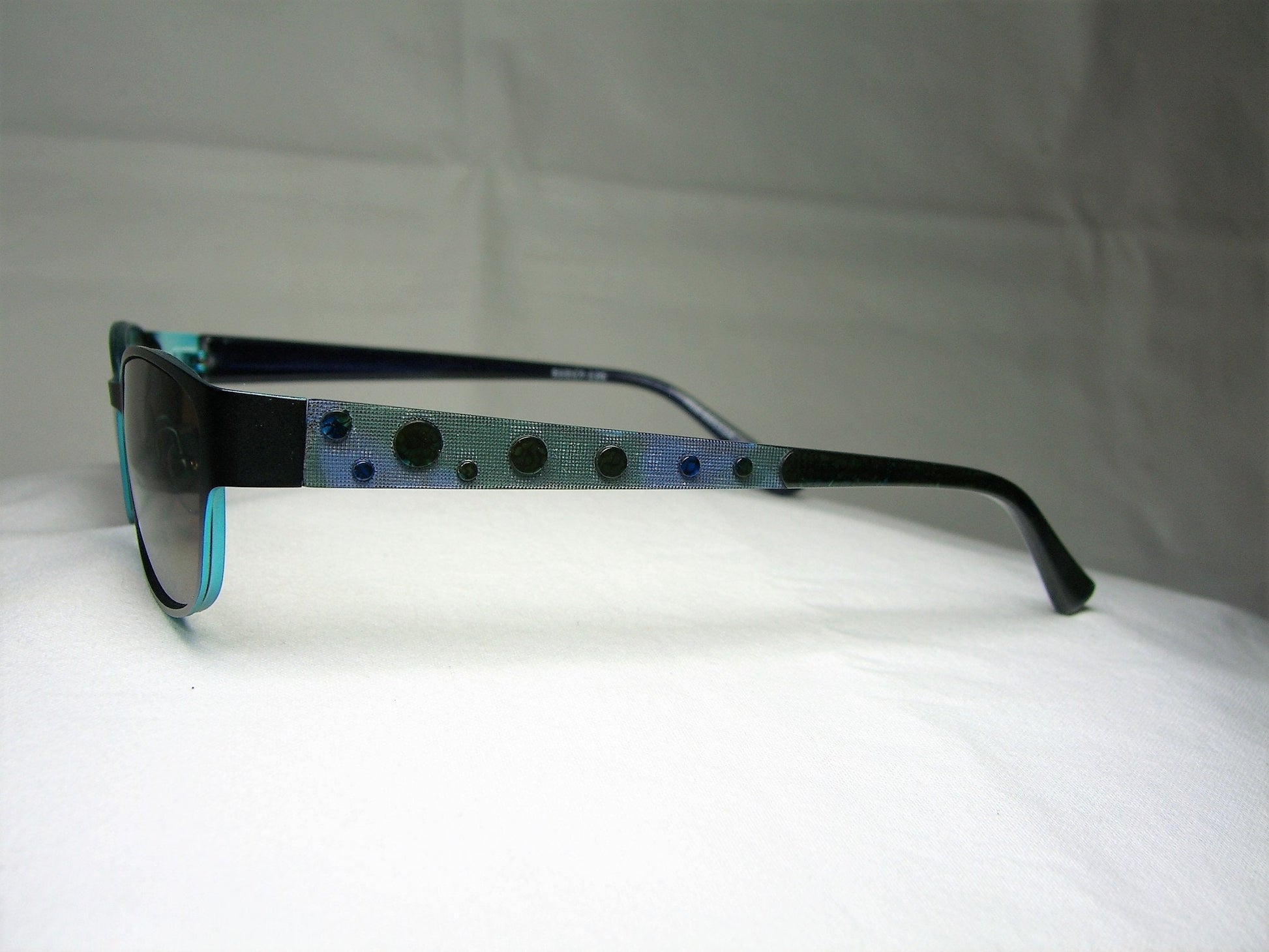 Hand made anodized jet black/teal blue metal alloy frame, complemented with Art Deco design temple stems (abalone acetate disks and stem ends), equipped with smoky green/brown poly-carbonate lenses.