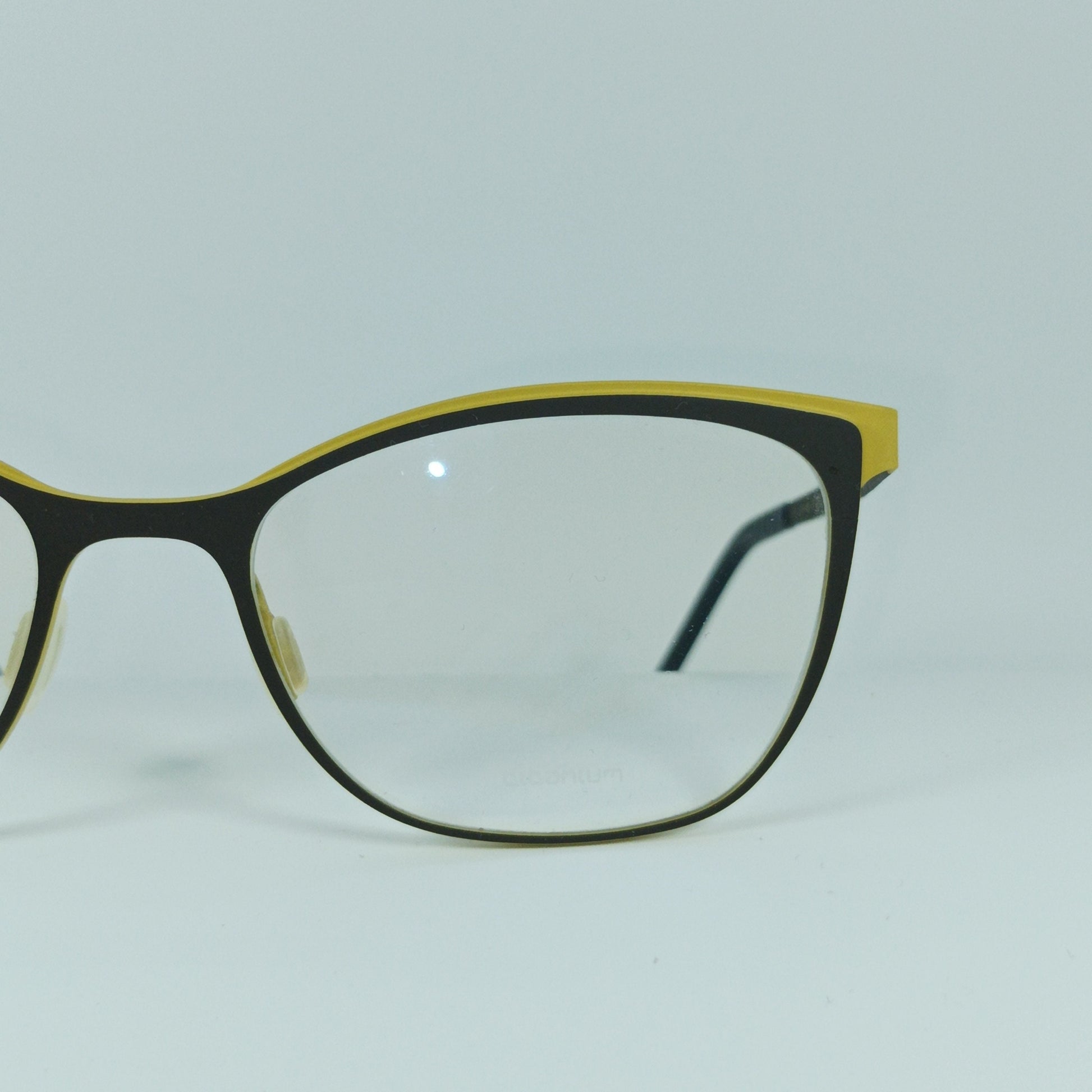 Hand made shale brown/yellow pure Titanium frame, ultra-light (weighing only 13 grams), complemented with herring bone patterned slim stems, equipped with high performance hinge systems, all in a superb modernist frame architecture.