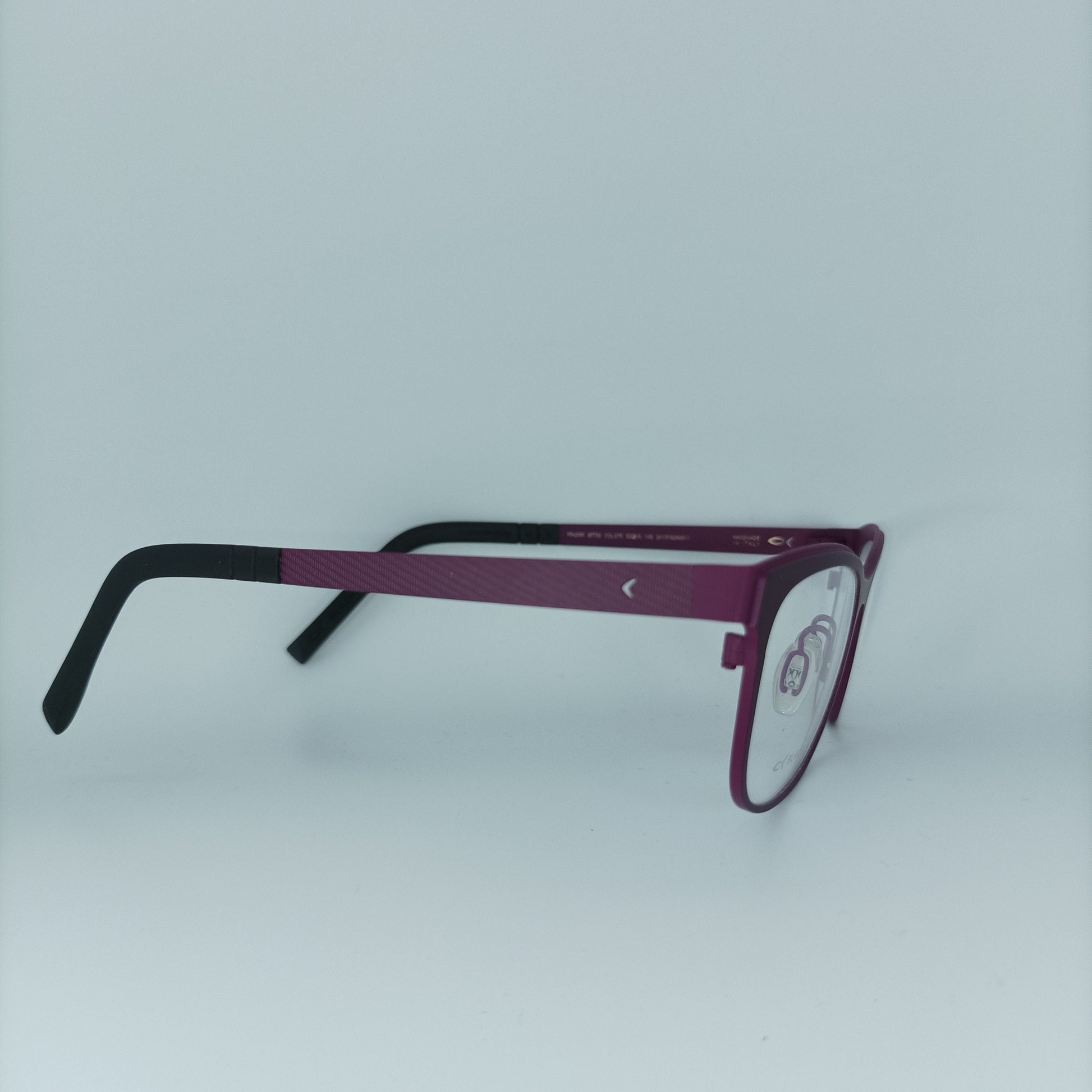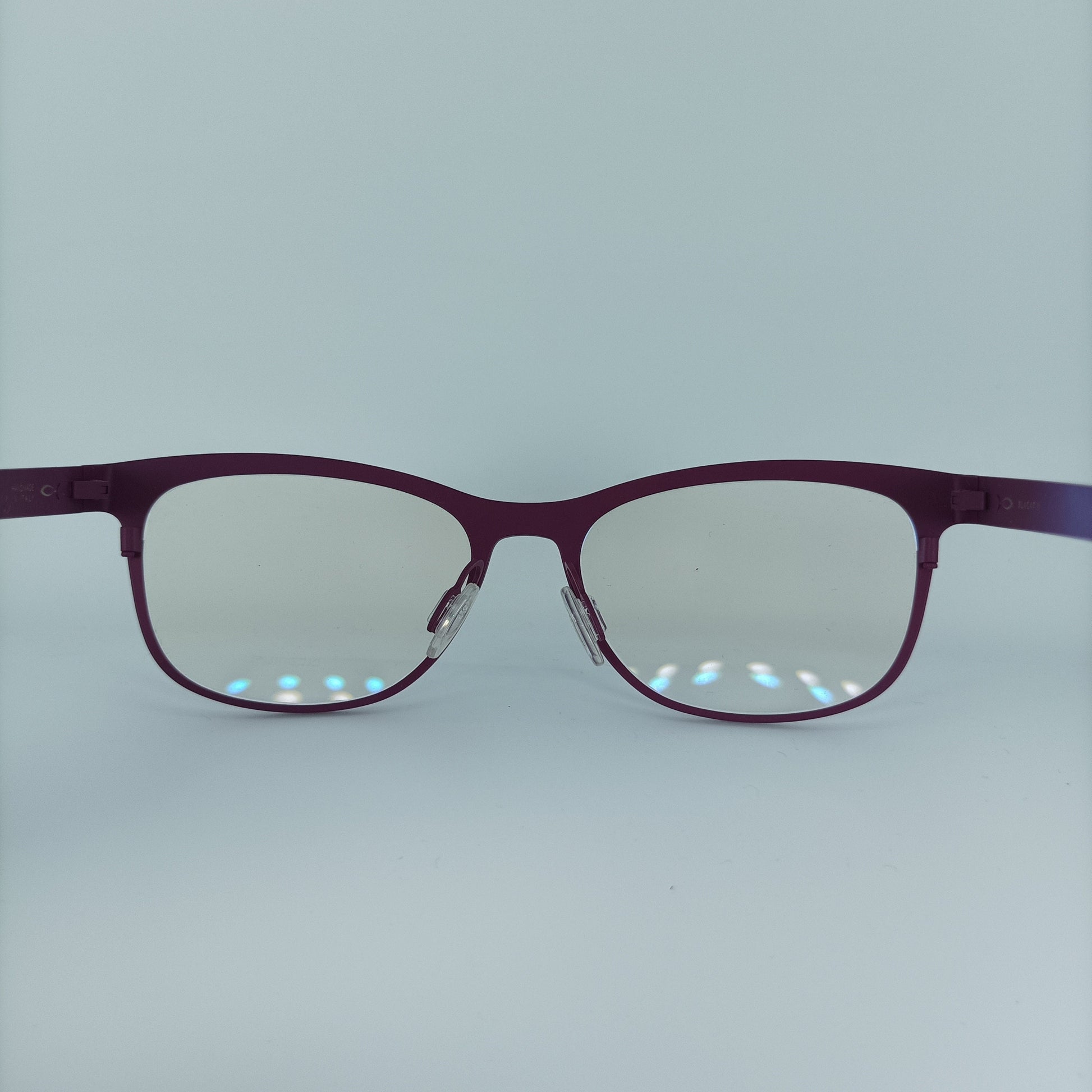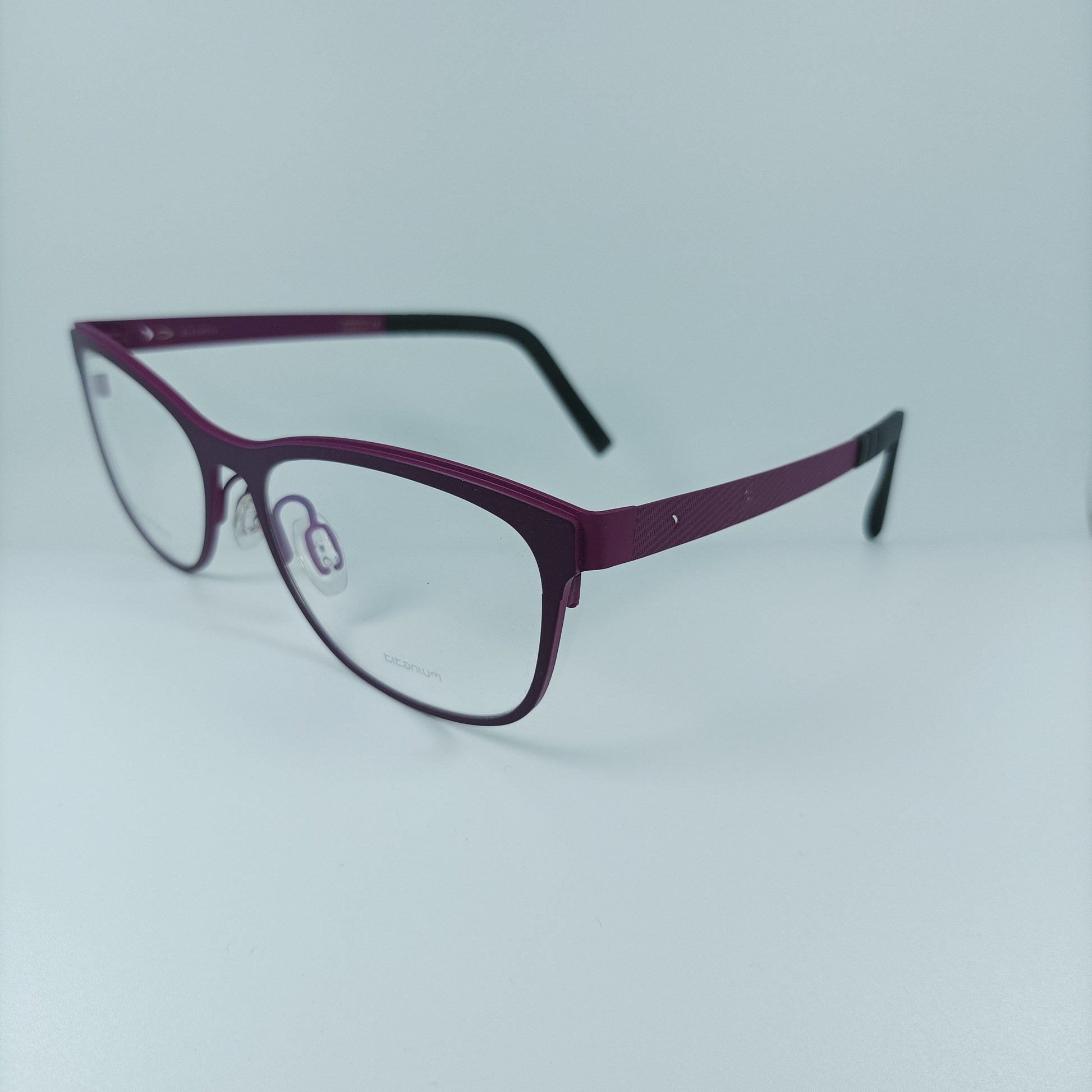 Hand made dark purple/dark fuchsia pure Titanium frame, ultra-light (weighing only 16 grams), complemented with herring bone patterned slim stems, equipped with high performance hinge systems, all in a superb modernist frame architecture.