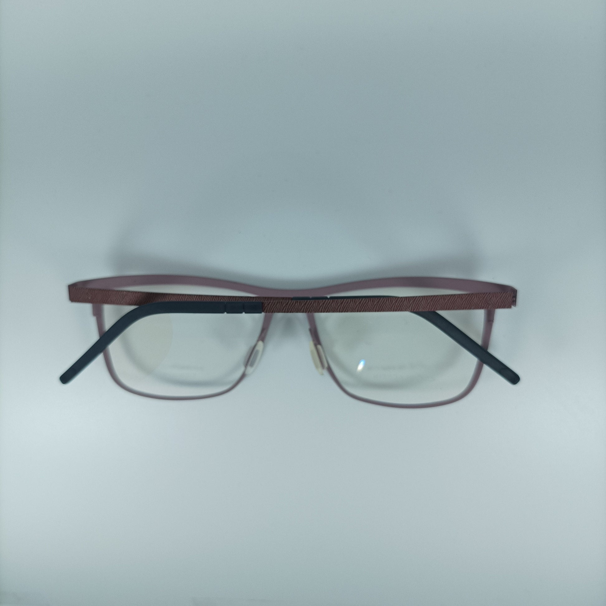 Hand made crimson red/pale lila pure Titanium frame, ultra-light (weighing only 16 grams), complemented with herring bone patterned slim stems, equipped with high performance hinge systems, all in a superb modernist frame architecture.