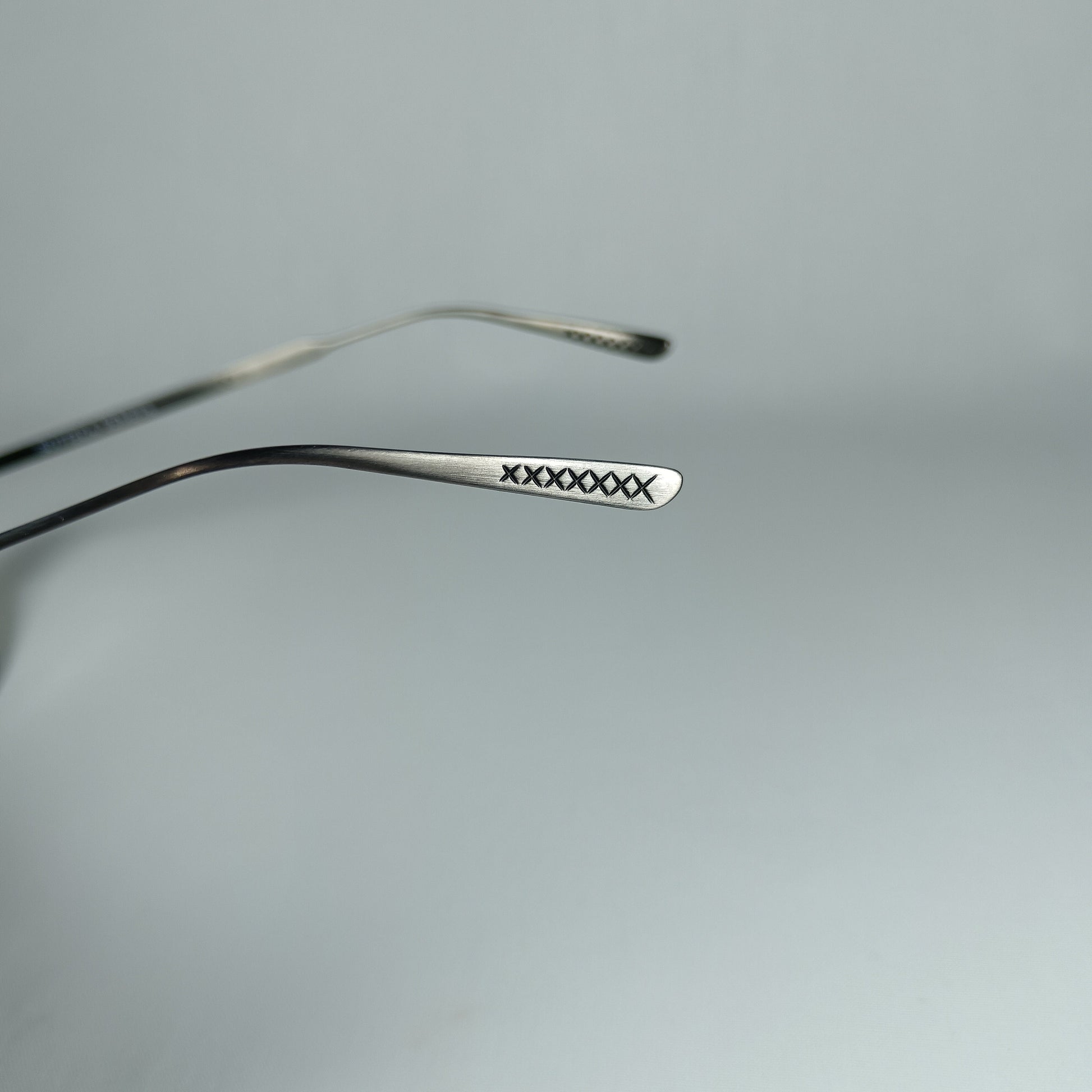 Hand made pewter anodized Titanium ultra-light frame (weighing only 22 grams, lenses included), fitted with high impact, polarized, smokey green TR 90 Nylon lenses, elegantly ornamented with tortoise Italian acetate brows and X engravings on stem ends, equipped with high performance hinge systems, all in a wonderfully modernist frame architecture.